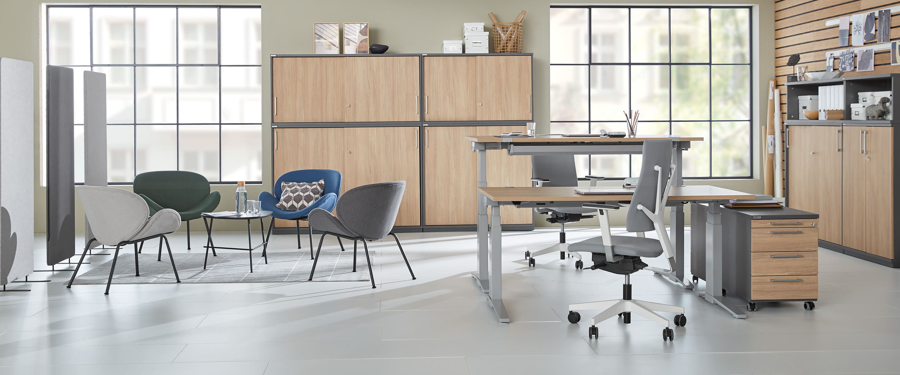 Entstanden ist ein Raum, der funktionale Arbeitsplätze mit einer offenen Kommunikationszone kombiniert: Ein höhenverstellbarer Schreibtisch mit ergonomischem Bürostuhl sorgt für komfortables Arbeiten, während die angrenzende Lounge-Ecke den schnellen Austausch fördert. Großzügige Stauraumschränke strukturieren den Raum und schaffen Ordnung.
